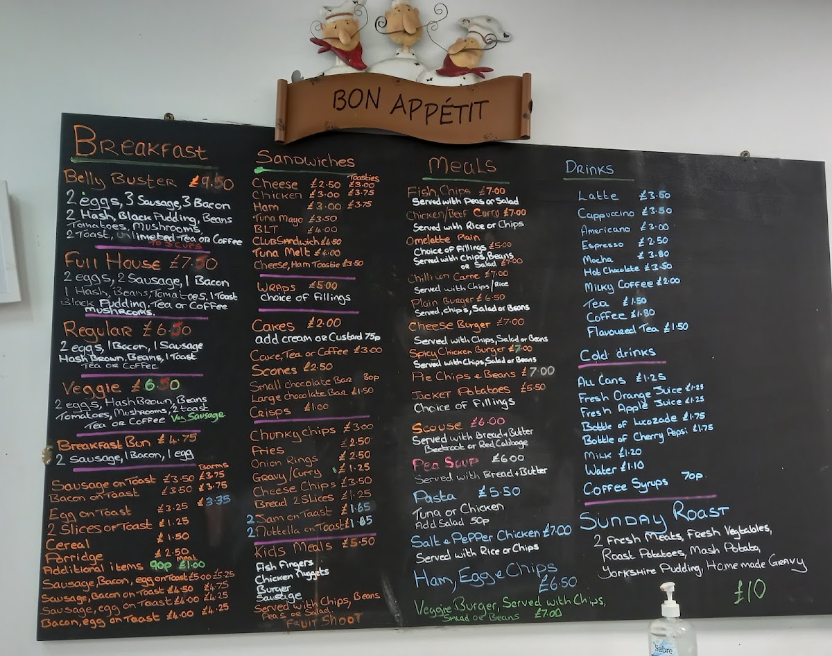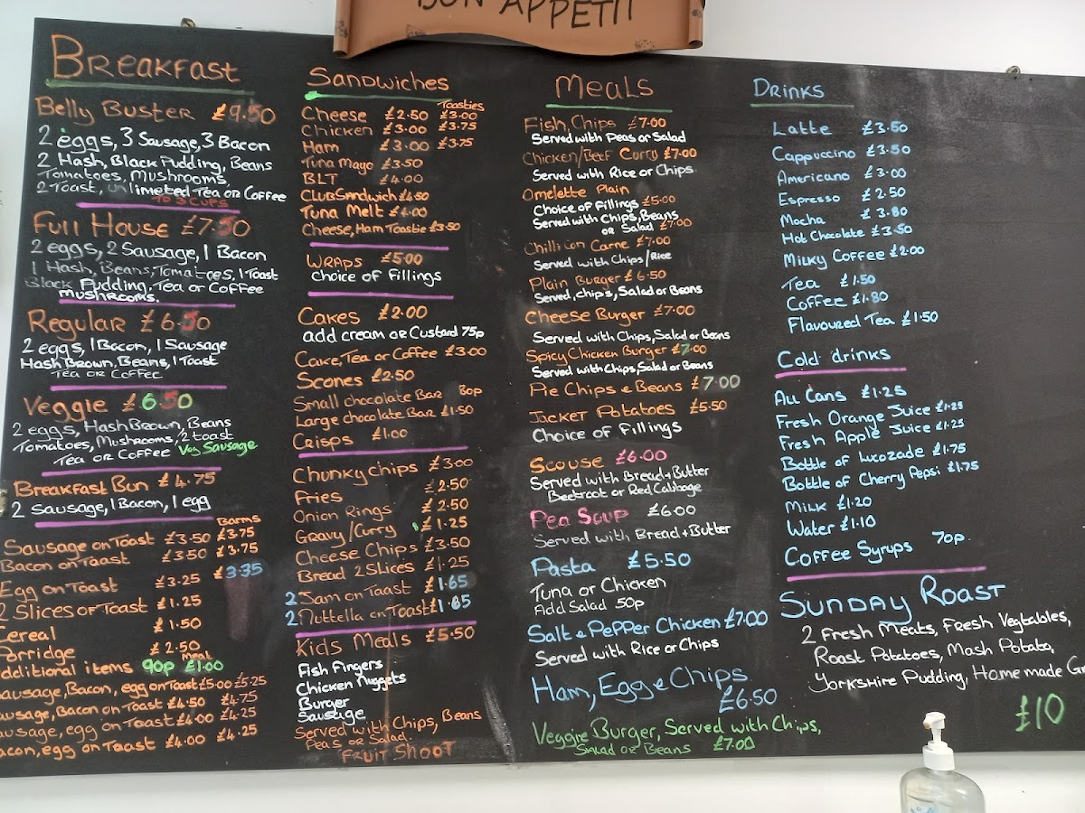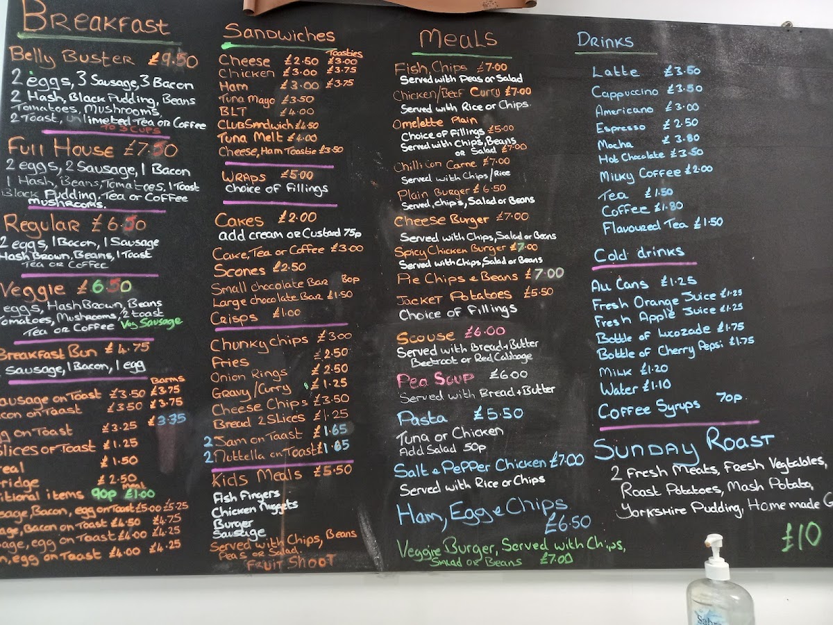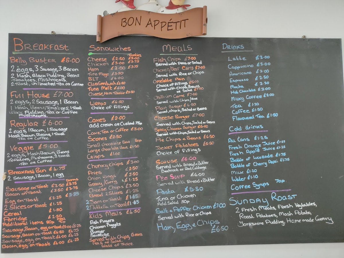 - Hot Food: Includes breakfast staples like English breakfast, sausage on toast, egg on toast, and omelettes with various fillings. Hearty meals such as roast dinners, pot roast, fish and chips, spicy chicken burger, and traditional local dishes like scouse are also available.
